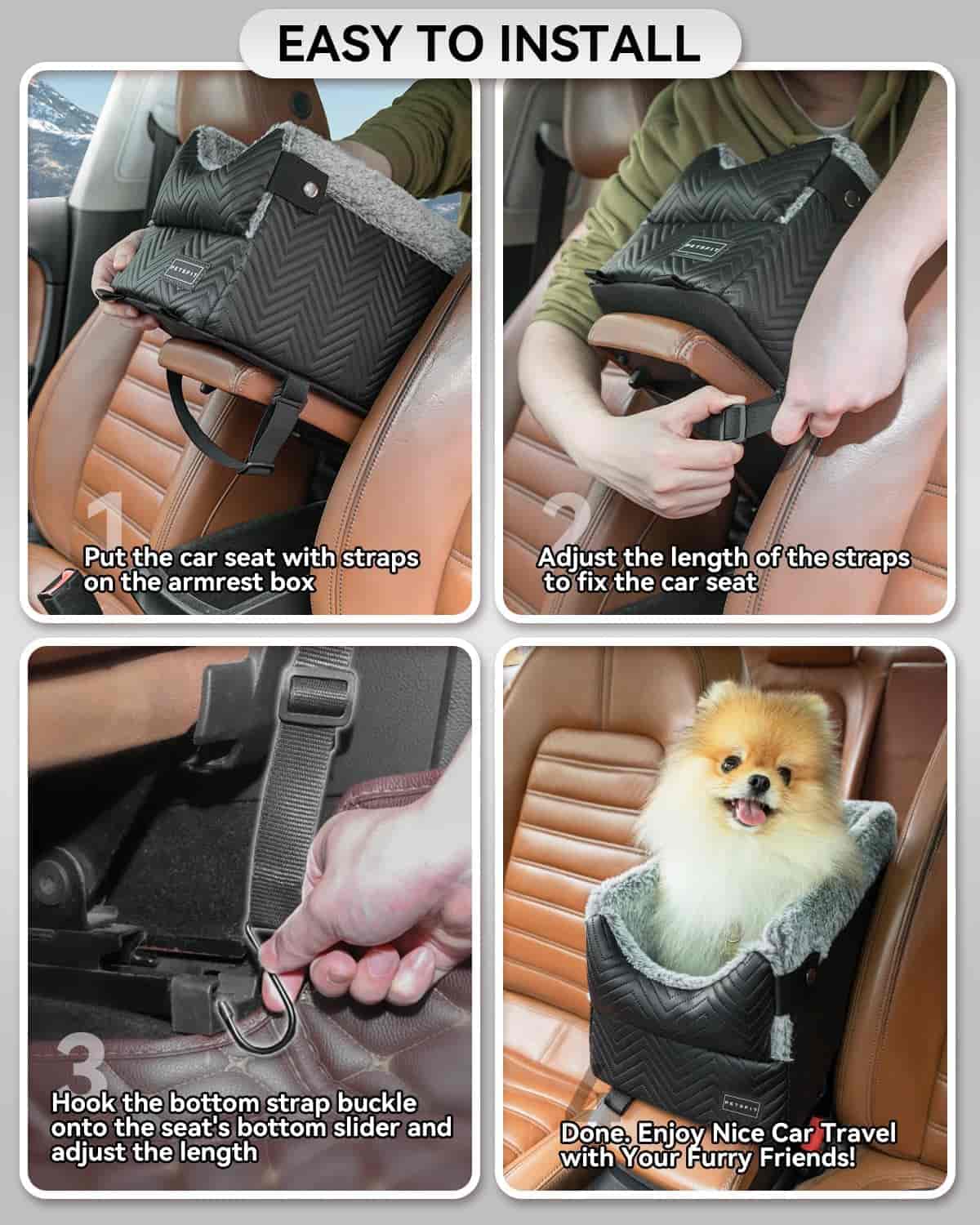 With dimensions of 17.5L × 10W × 8.5H inches, this console dog car seat is perfect for small dogs or cats weighing up to 9 lbs. It includes two adjustable bottom webbing straps that allow for a snug fit on the car armrest, preventing shaking and the risk of falling off.