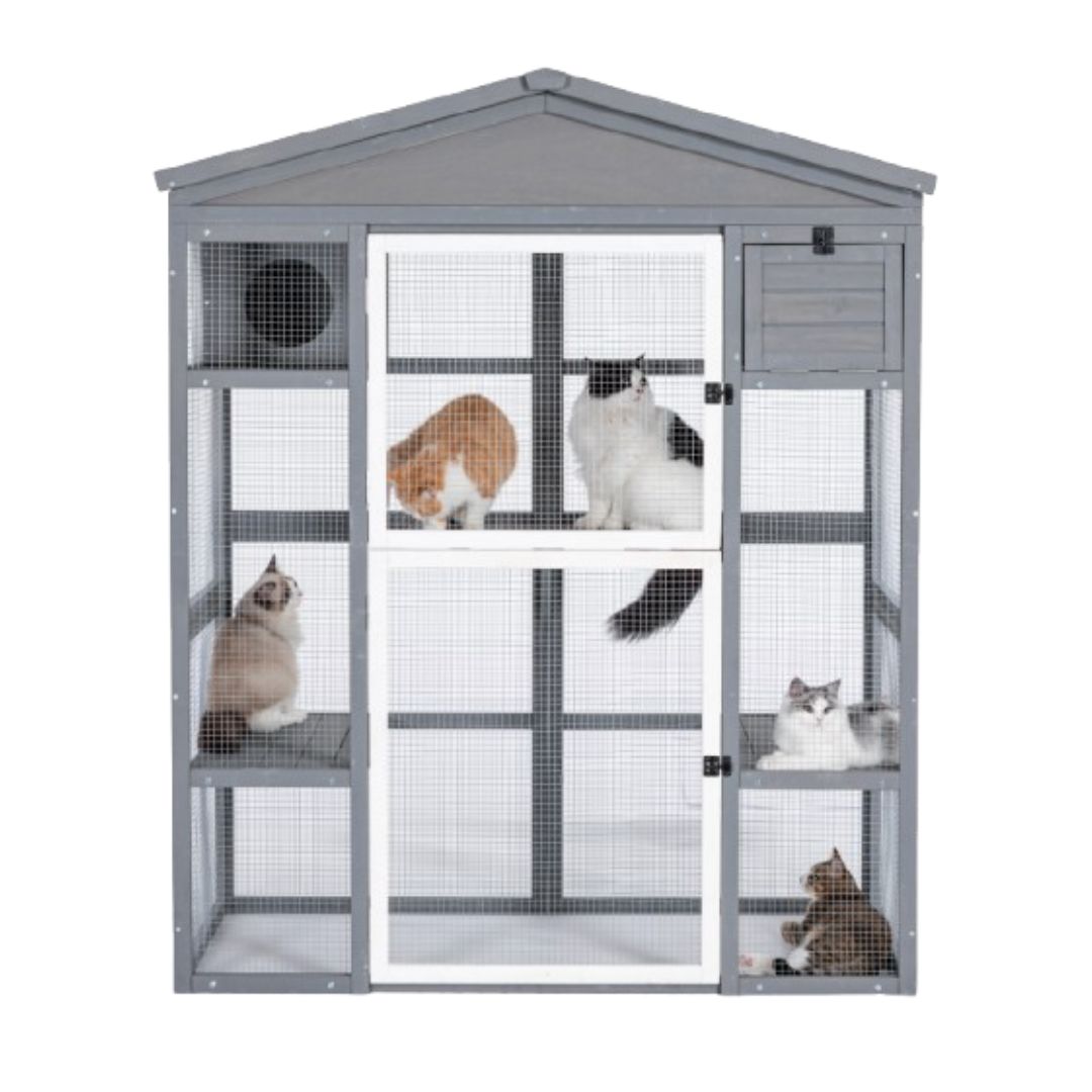 - We provide cats with a spacious outdoor play area. Our cat catio has two front doors that can be independently closed to prevent pets from escaping when you open the door. It also features two side platforms and a central platform, allowing your cats to jump and bask in the sun to their heart's content.