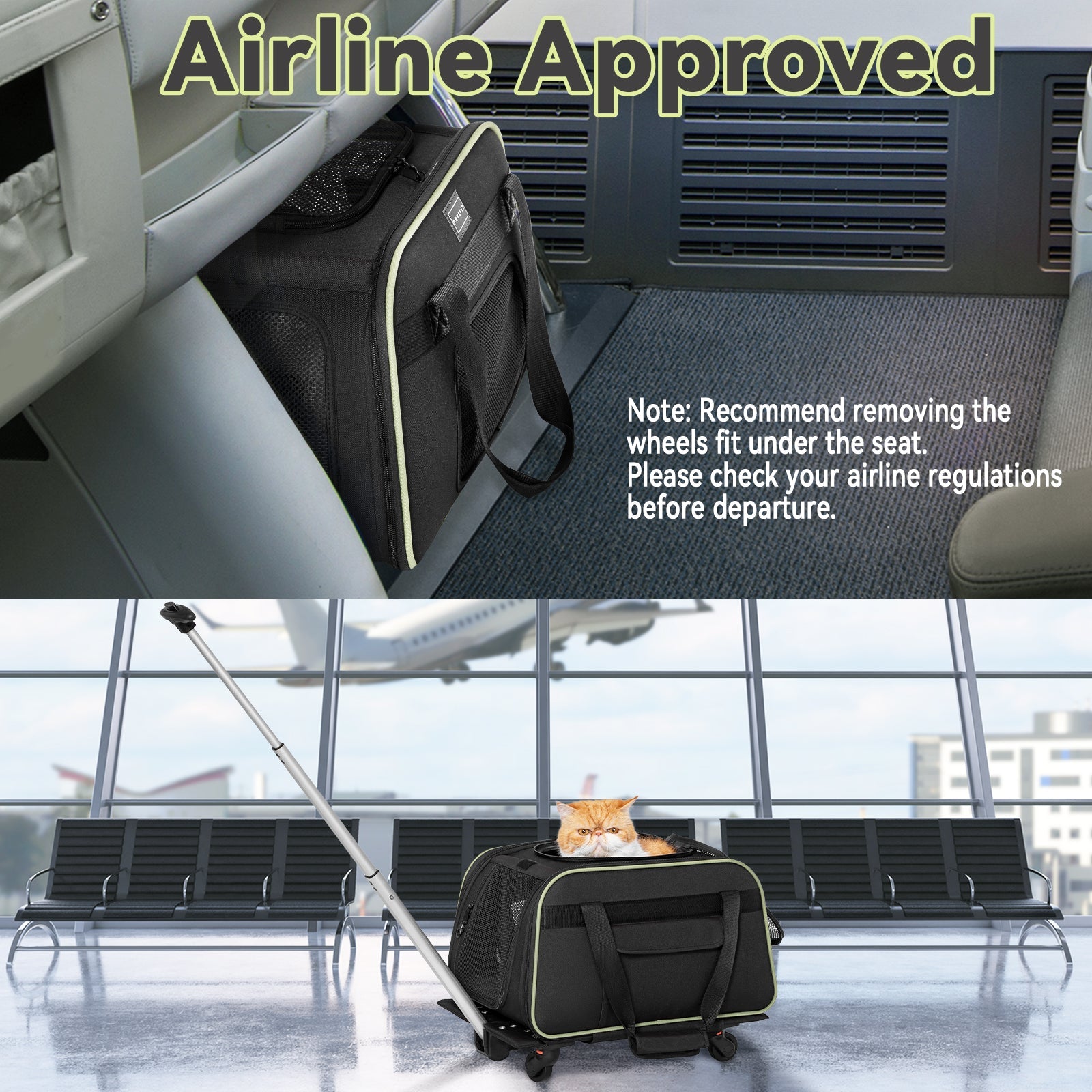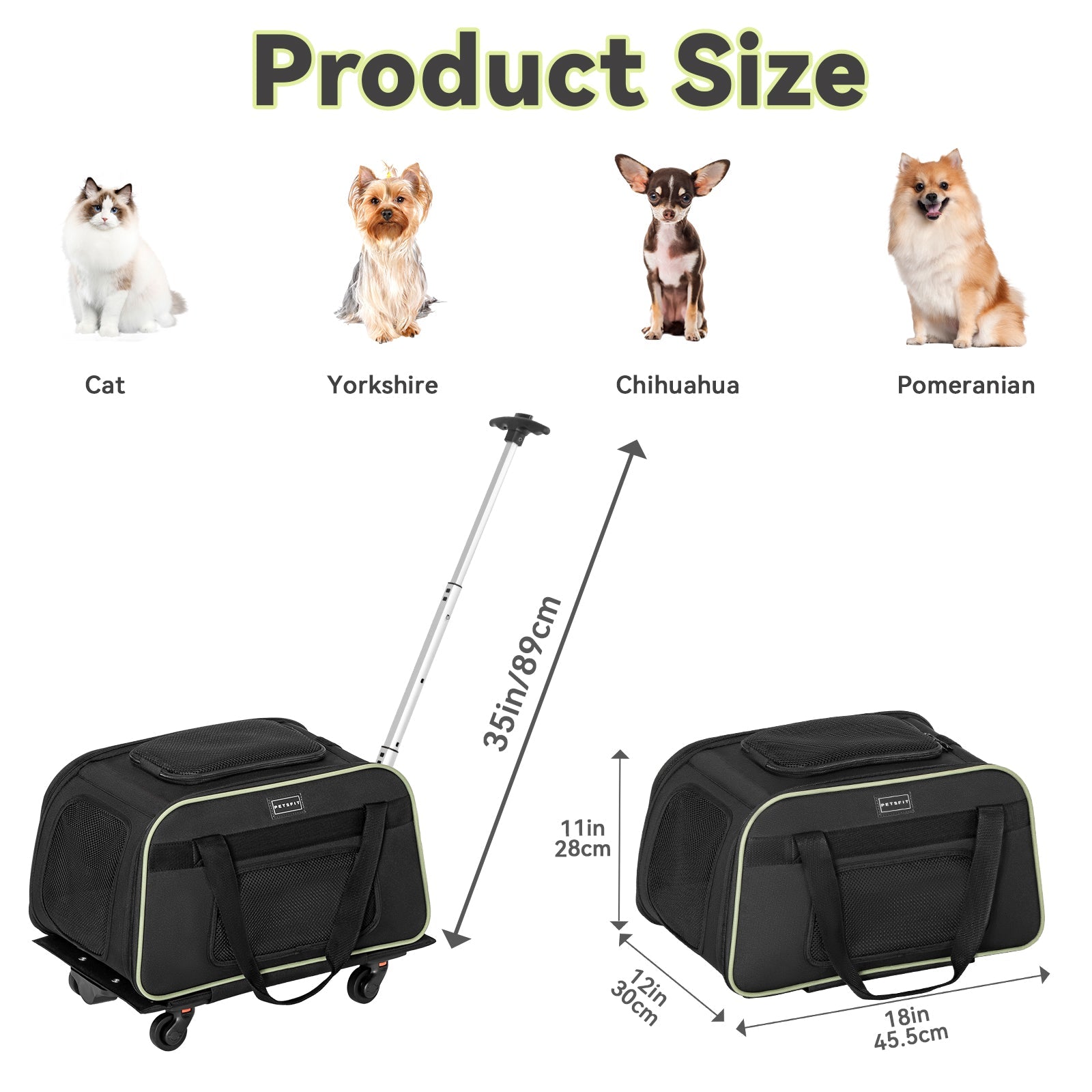 Product Size: The Pet Travel Carrier with Wheels measures 20"L x 12" W x 11" H (wheel height not included). We offer three sizes to suit your needs: 25.5"L x 14" W x 14"H and 23"L x 13" W x 14" H (not airline approved), ideal for two small dogs or a medium-sized dog, as well as multiple cats. The 20"L x 12"W x 11"H size is airline-approved and fits under the seat of most airlines when the wheels are removed, making it perfect for small cats and kittens.