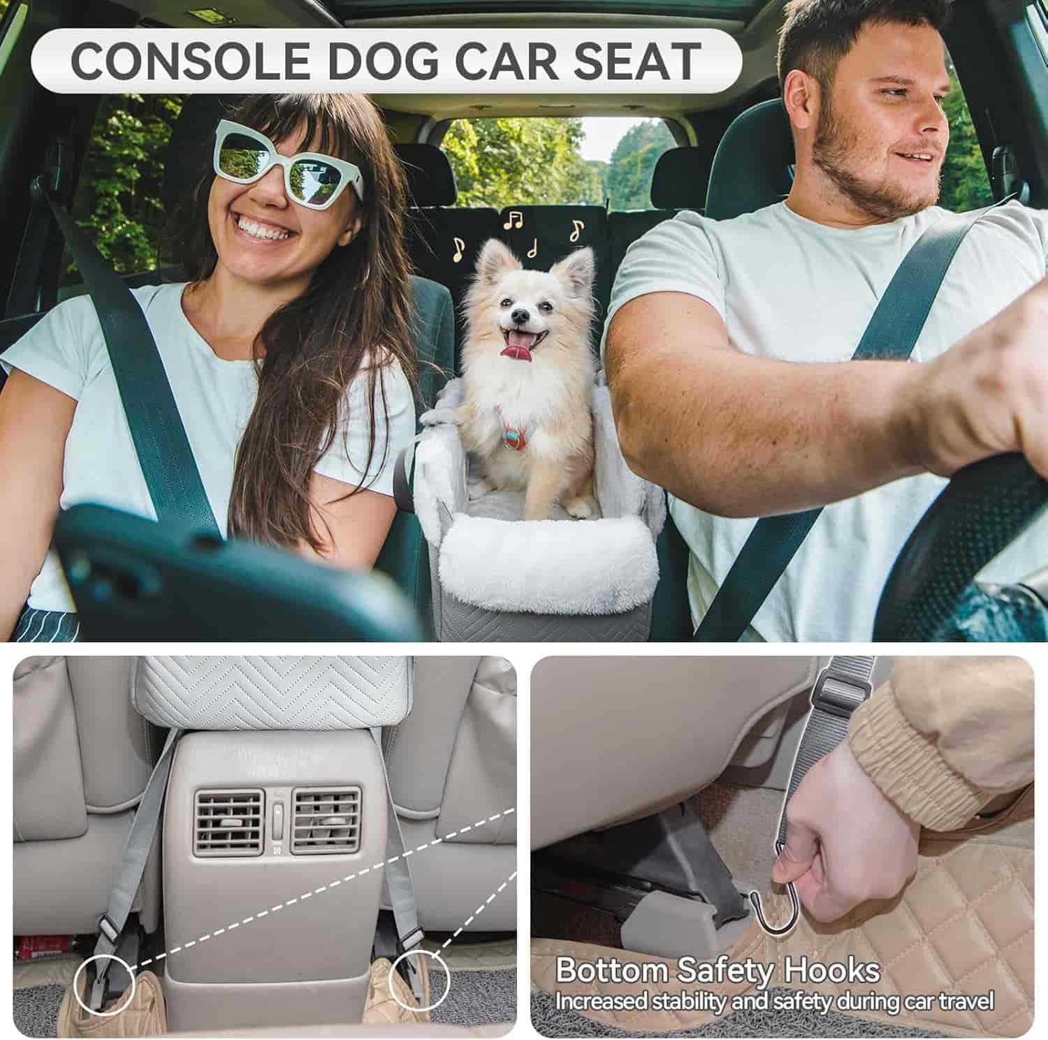 Perfect for dogs weighing up to 12 lbs, our center console dog car seat (17.5L x 10W x 8.5H inches) combines high-quality waterproof PU leather with soft imitation rabbit velvet, providing both luxury and comfort for your pet during travel.