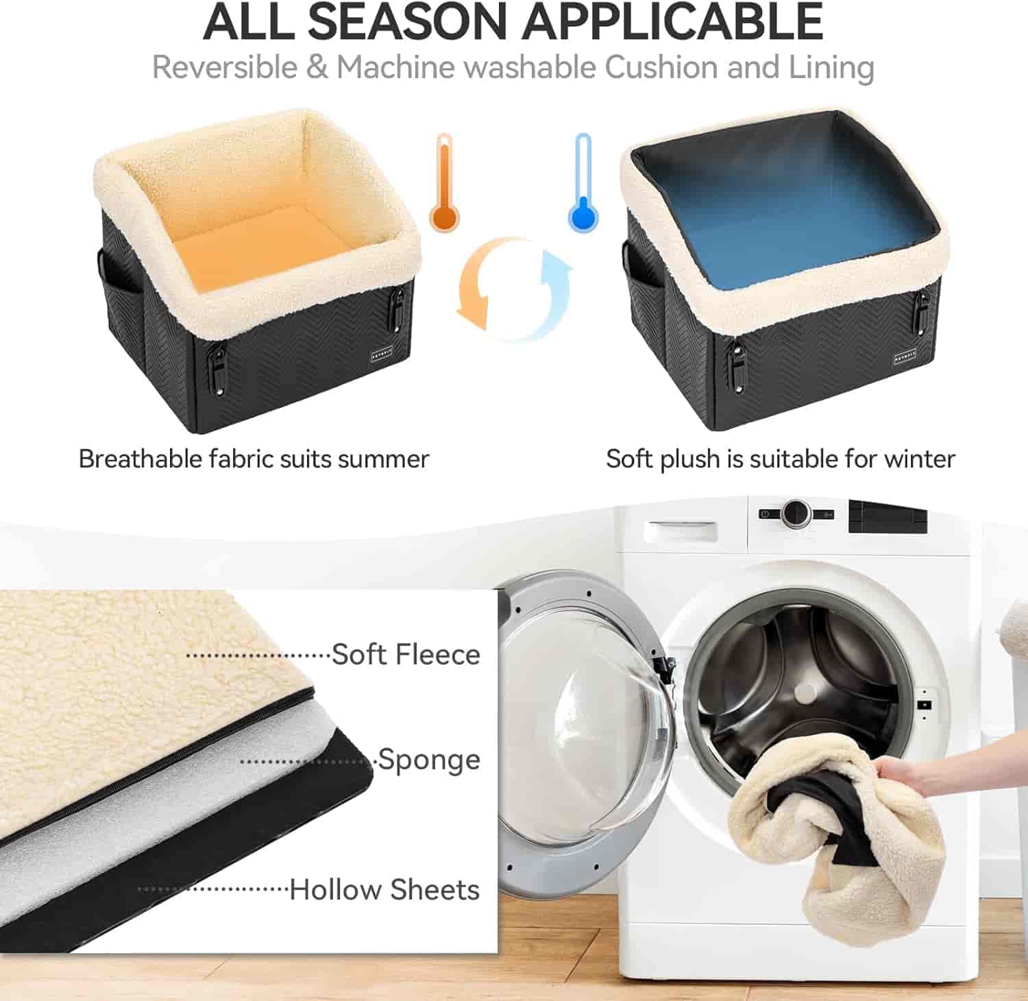 The small dog car seat boasts a unique cushion design with one side made of soft fleece and the other crafted from durable Oxford cloth, catering to different weather conditions and pet preferences. The cushion is detachable and washable, and the fleece-lined edges provide first-class comfort for your pet during rides.